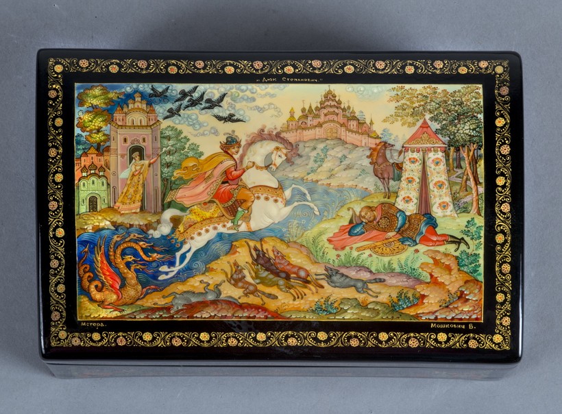 Также здесь представлены иконы мстерских мастеров, но они здесь выставлены, скорее, чтобы представить уровень мастерства художников, основной упор все равно сделан на миниатюру. Сюжеты - всем известные, но очень интересные. Основная тема росписи - это сказочные и литературные сюжеты.