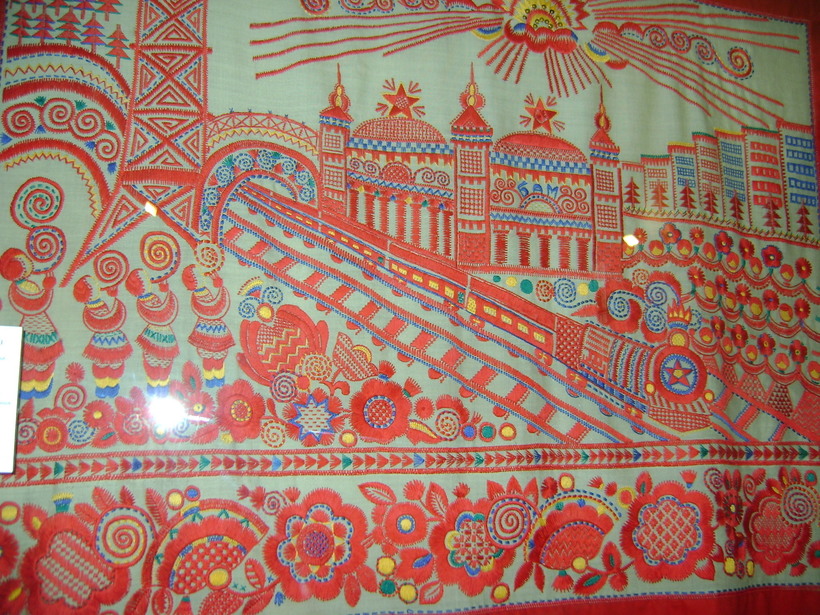 Если подняться выше, то можно обнаружить еще одну выставку - это вышивка. Оказалось, что во Владимире есть очень много традиций, связанных именно с вышивкой. Здесь представлены образцы известной владимирской глади - красота невероятная - растительные орнамент, выполненный белыми нитями на белом же фоне. Невероятная красота. А еще здесь представлены образцы известного владимирского шва - крупные стежки цветными нитками, тоже красота невероятная.