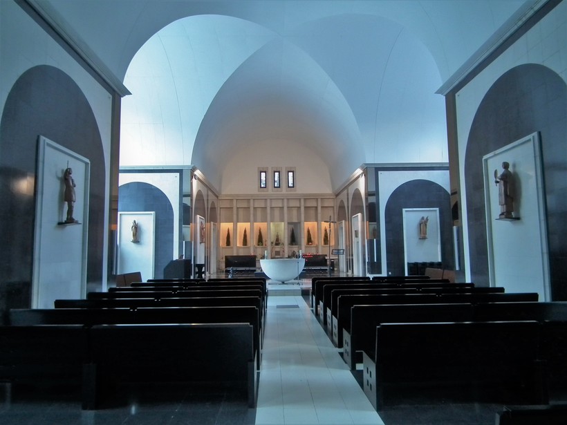 А внутри все так же просто и очень светло. Большие окна пропускают много света в помещение, через них мы видим боковые коридоры и заснеженный внутренний дворик. Стены отделаны черным и белым мрамором, есть несколько небольших статуй Святых. Прочих украшений интерьера вовсе не видно, только в центре зала стоит источник воды в виде большой полусферы. Мне было легко находиться здесь, в отличие от православных церквей, где на меня будто давит атмосфера.