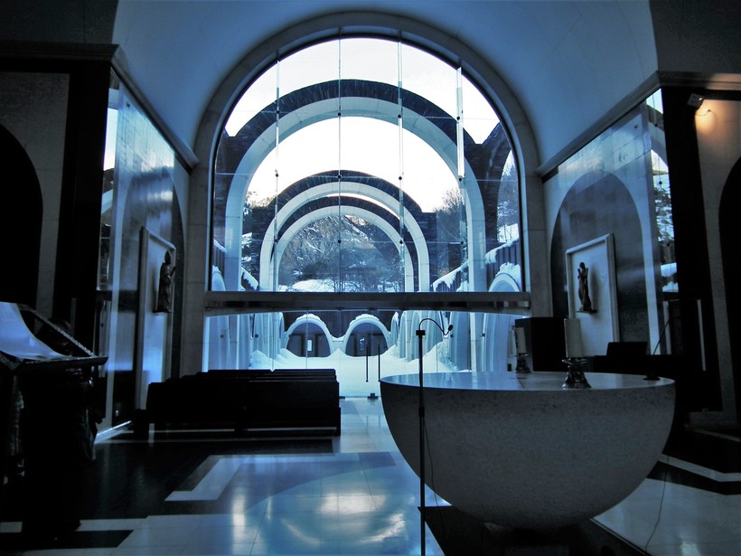 Для меня церковь выглядела очень непривычно и масштабно. Внешний вид минималистичен: простые линии и отсутствие ярких элементов, что было по-своему приятно и понятно глазу. Отделка окон и арок белой плиткой идеально гармонирует со снежными склонами.