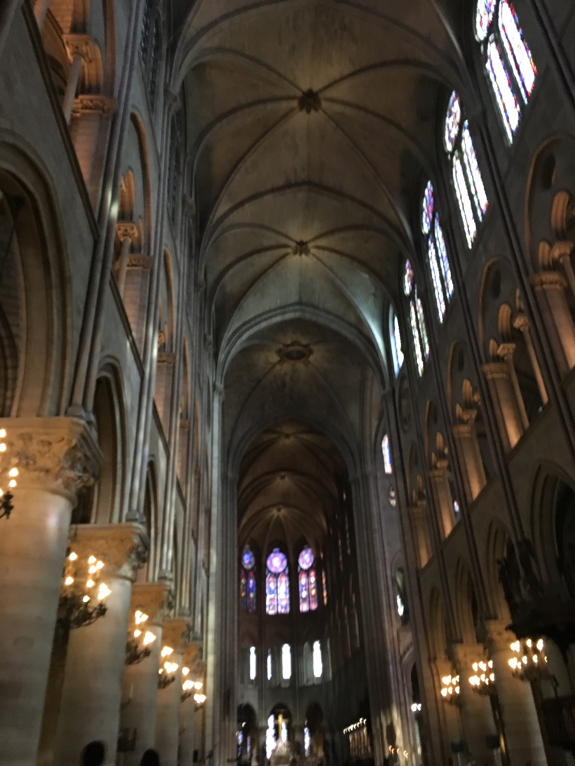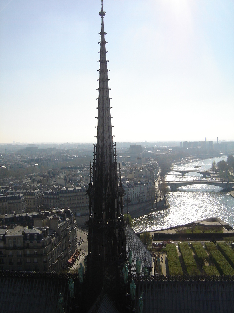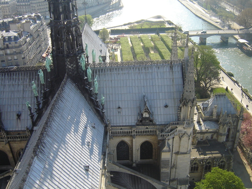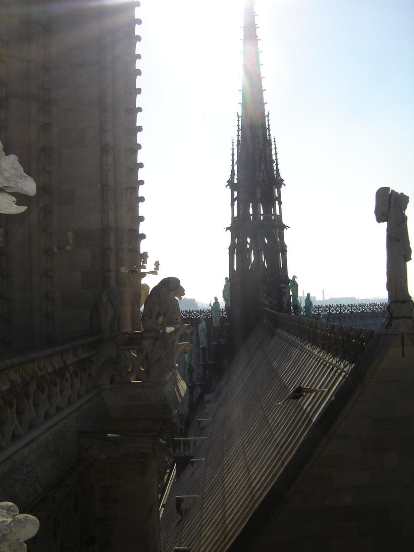 Через несколько дней, немного познакомившись с Парижем, я вернулась в Нотр-Дам на экскурсию. Собор внутри был совсем другой, праздничной службы, что понятно, уже не было, и я посмотрела множество уникальных экспонатов собора и поднялась на крышу. Древние, толстые, деревянные балки, державшие крышу, были хорошо видны при подъеме, так же как и старинный колокол. В какой то, момент мне показалось, что вымышленные герои Виктора Гюго, все еще обитают здесь. Я вышла на смотровую площадку и довольно близко увидела шпиль собора и всем известных горгулий. Прекрасный солнечный Париж, был шикарно виден с крыши Нотр-Дама и мне показалось, что нет более прекрасного места, на земле.