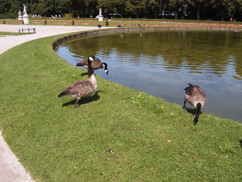 Напротив главного фасада находится большой водоем, который переходит в опоясывающий дворец канал. Был я там в летнее время, и вокруг в изобилии паслись птицы – что-то среднее между гусями и гигантскими утками. Кстати, пардон за пикантную подробность, но для меня было открытием, что… кхм… экскременты у них не жидкие, как у голубей, а больше похожи на кошачьи «колбаски»:)))