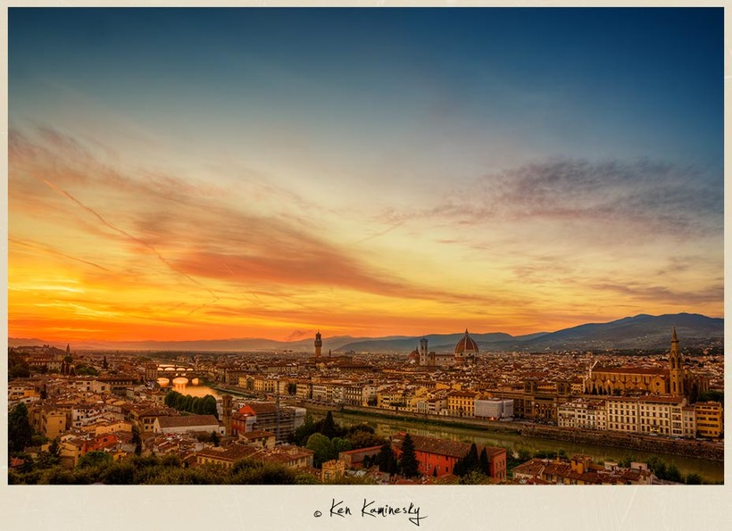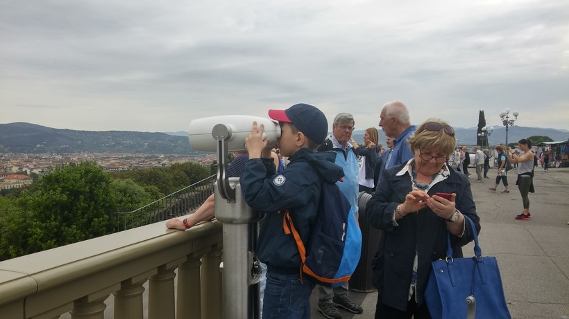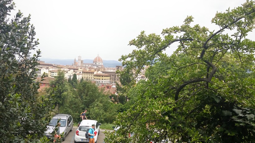 Весь исторический центр города виден как на ладони: плавно течет река Арно, за ней возвышается огромный купол Санта Мария дель Фьорре – главный собор города—творение Брунеллески, колокольня Джотто, видна базилика Санта Кроче – одна из самых старых флорентийских церквей, мост Понте-Векьо и другие мосты… Но главное, здесь ощущается дух Флоренции! Эти красные черепичные крыши, эти облака над городом, и эти величественные здания…от этого захватывает дух!