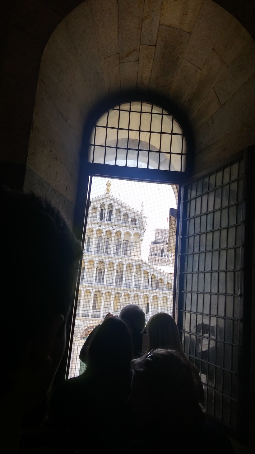 Все-таки лучше приходить раньше утром, когда народа не так много; не надо стоять в очереди к окну на верхнем ярусе Баптистерия, из которого открывается чудесный вид на Пьяццу дети Мираколли. А вот, что происходит, когда фотографируешь не "из того" окошка - видна одна сетка: