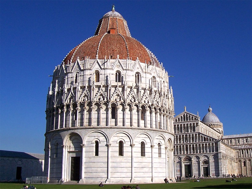 Необыкновенная постройка 14-го века, самой большой баптистерий Италии, Battistero (от имени Иоанна Крестителя – San Giovanni Battista) дополняет ансамбль построек на Площади чудес (Piazza dei Miraccoli).