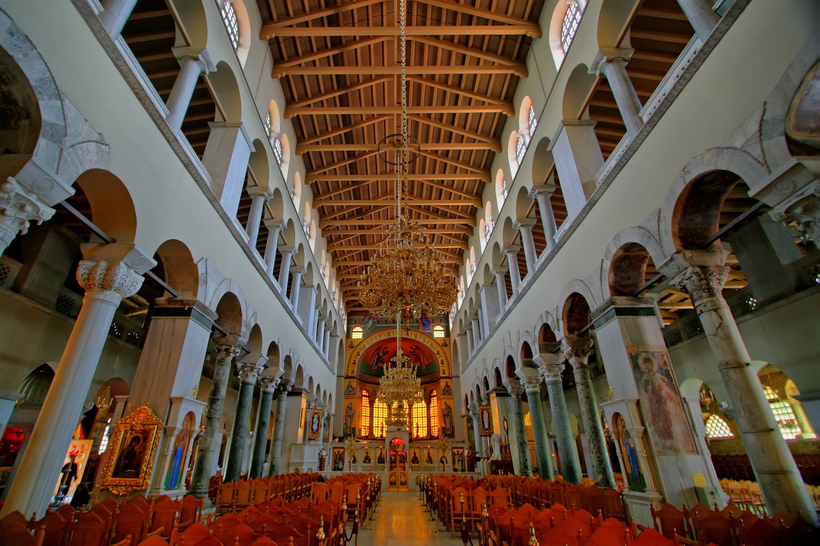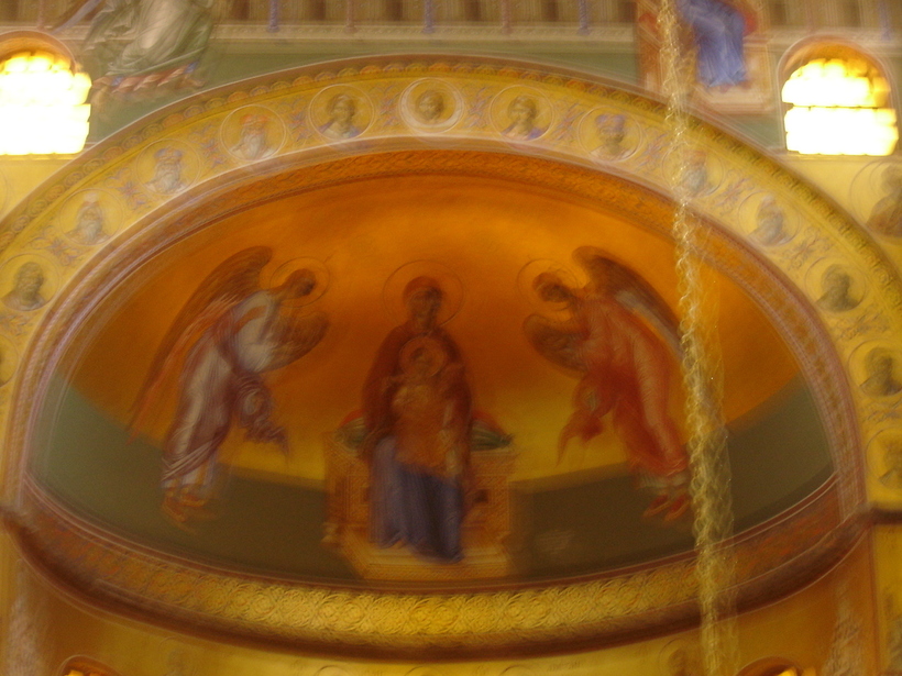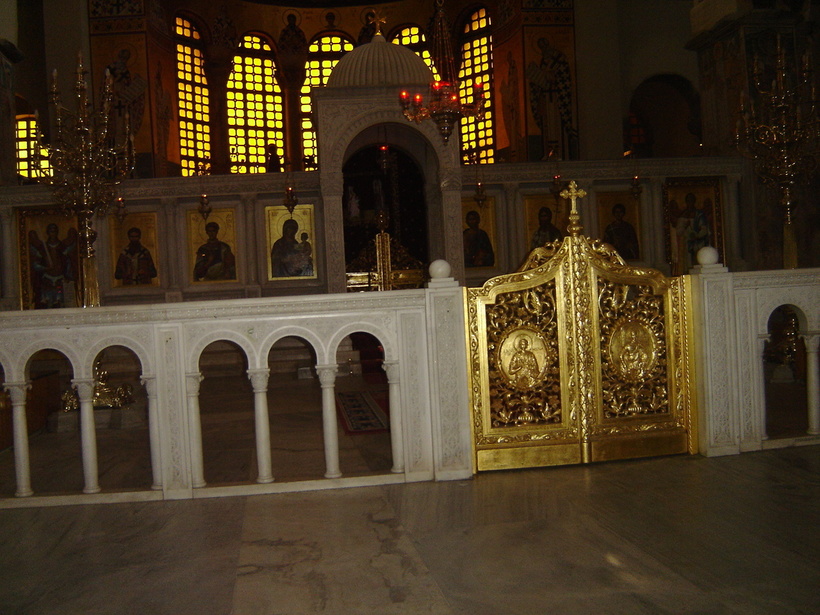 Я вошла внутрь базилики, совсем не ожидая того, что увижу внутри. Все-таки православные храмы Греции и России совсем разные и в этом я здесь убедилась почти сразу. Мне показалась, что внутри, храм больше похож на католический, чем на православный.