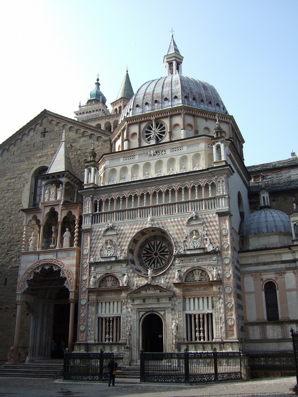 Первое, что вы видите, когда проходите под арками Старой ратуши Бергамо к храму Санта-Мария-Маджоре – это не сам храм, а капелла. Я, честно говоря, даже сначала не поняла, что это отдельное здание, так хорошо оно вписано в окружающий ансамбль. Восьмигранный купол и особенно башенка, которая его венчает, сильно напоминает элементы собора, стоящего рядом – такая интересная перекличка и гармония. Хотя на самом деле, исследователи отмечают, что для строительства капеллы была разрушена ризница собора.