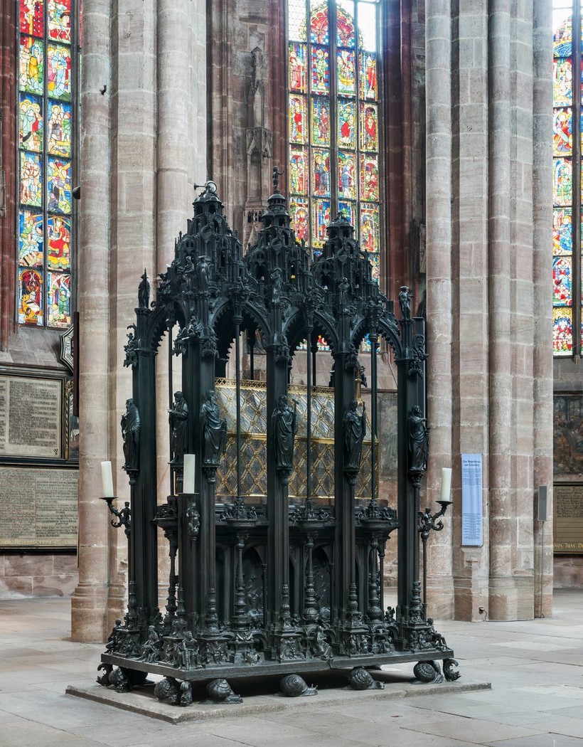 - Увидеть могилу святого Себальда. К своему стыду, долгие годы я совершенно не задумывалась о том, в честь кого церковь получила такое название. А однажды я случайно попала на бесплатную экскурсию по храму, тут всё и прояснилось. Этот святой жил здесь в отшельничестве в 11 в., был чудотворцем, а позднее был избран самими жителями в качестве своего покровителя. Здесь же, в соборе, он и был похоронен, и в 16 в. нюрнбергские мастера изготовили великолепный и очень тонкий по технике саркофаг.