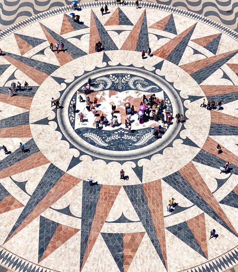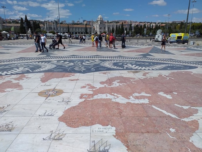 Несмотря на то, что стороны памятник кажется одной монолитной фигурой, внутри он имеет видео и выставочные залы, а также лифт до смотровой площадки. Площадка же перед памятником - тоже место знаковое. Гранитом выложены здесь карта мира в розовом, голубом и белом тонах, а также "роза ветров". Но и сама карта не столь проста - здесь указаны траектории и даты морских экспедиций португальцев. Как говорит гугл, "роза ветров" была подарком Португалии от ЮАР в 1960 году. Мозаика столь огромная, что, кажется, одна только плиточка размером с детсадовского ребенка, если не больше!