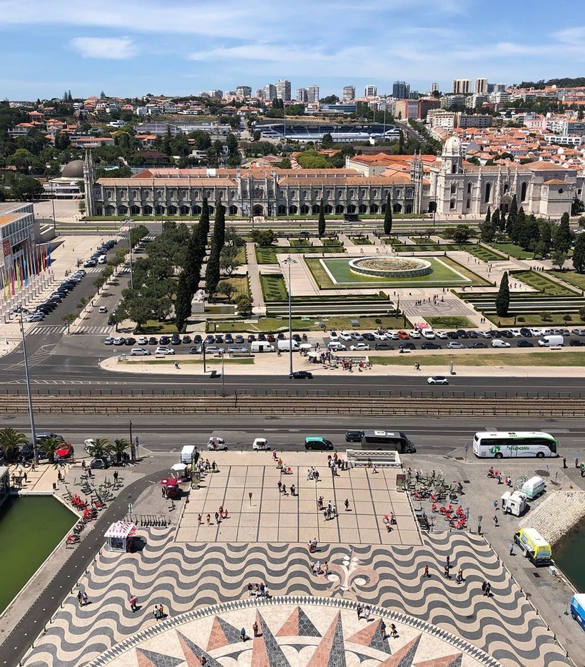 А также с площадки хорошо видна вся мозаика "роза ветров", что у подножия монумента. А на другой стороне Тежу можно увидеть памятник Иисусу - уменьшенную точную копию памятника Создателю, что стоит в Бразилии, в Рио-де-Жанейро.