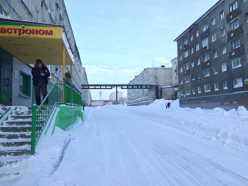 Сильный ветер, холодно. Двери подъездов подпирает местный транспорт – японские снегоходы, сзади прицеплены сани. Мороз лютует. Из одежды надел зимний вариант очень теплых вещей. Плотная зимняя куртка защищает против местных морозов. Солнце светит ярко. Тепла, правда, оно приносит мало. Все открытые части тела: уши, лицо, нос, быстро замерзают. Хорошо одеться обязательно: