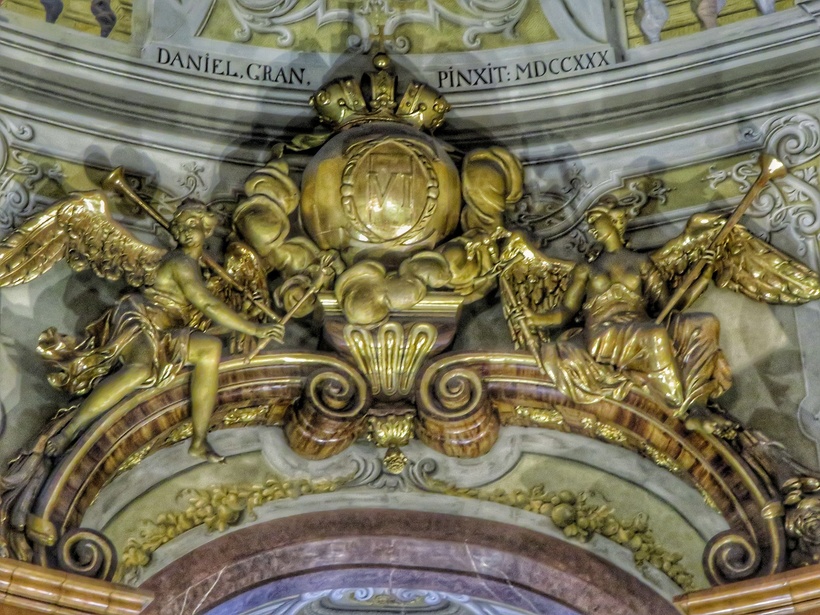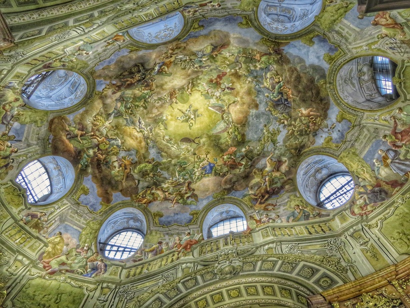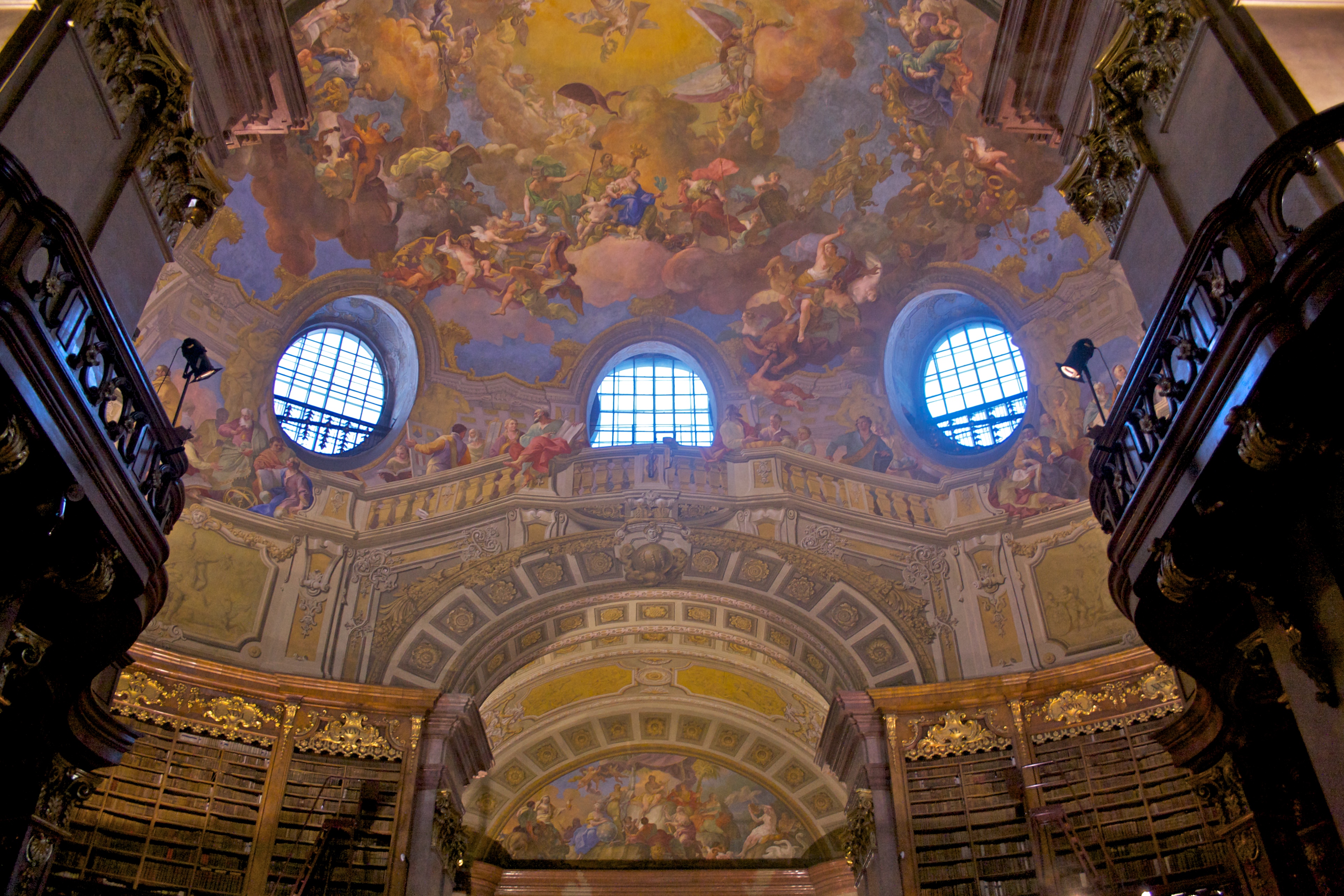 Справедливости ради замечу, что не только коллекция парадного зала достойна внимания. Само помещение впечатляет не меньше: огромные резные стеллажи, от пола до потолка заставленные массивными томами в кожаных переплетах, мраморные колонны, статуи императоров из рода Габсбургов и, конечно, невероятный сводчатый потолок, украшенный роскошными фресками.