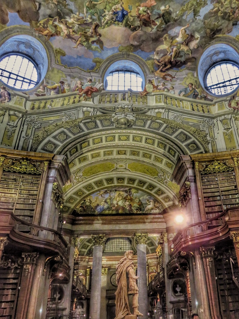 Этот зал (Prunksaal) - настоящее сокровище, самое сердце австрийской Императорской Библиотеки, которую позже переименовали в Национальную - по праву считается одним из самых красивых библиотечных залов мира.