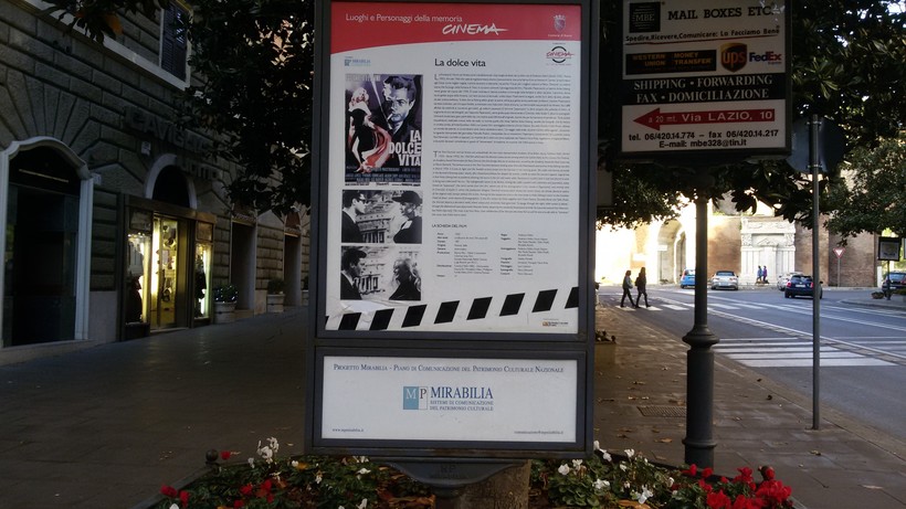 Как герои фильма Федерико Феллини «Сладкая жизнь» (La Dolce Vita). Ведь именно здесь снимались многие кадры этого знаменитого фильма. И сегодня Via Veneto часто называют улицей из «Сладкой жизни». В центре улицы установлен вот такой информационный стенд с кадрами из фильма.