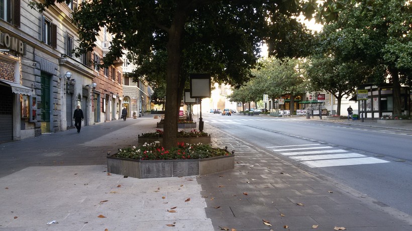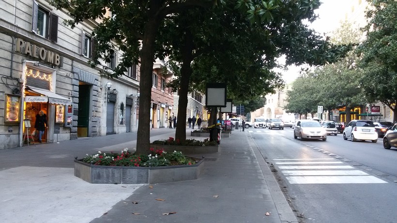 Улица Виа Венето (или, точнее, полное ее название Via Vittorio Veneto) – одна из известных, знаковых улиц Рима. Я не знаю, как точнее ее охарактеризовать. Она не такая презентабельная, но при этом демократичная как Via del Corso, не такая помпезная как Via dei Condotti с витринами очень дорогих магазинов… Via Veneto – скорее, аристократичная, элегантная. Элитные фешенебельные гостиницы, дорогие кафе и рестораны, магазины престижных марок. Создают атмосферу и изящные клумбы вокруг деревьев с цветущими (в декабре!) цветами. При этом улица Via Veneto немноголюдная и довольно широкая. По ней можно прогуливаться так неспешно, забыв обо всем, и просто радоваться жизни, чувствуя себя так, как будто весь мир у твоих ног…