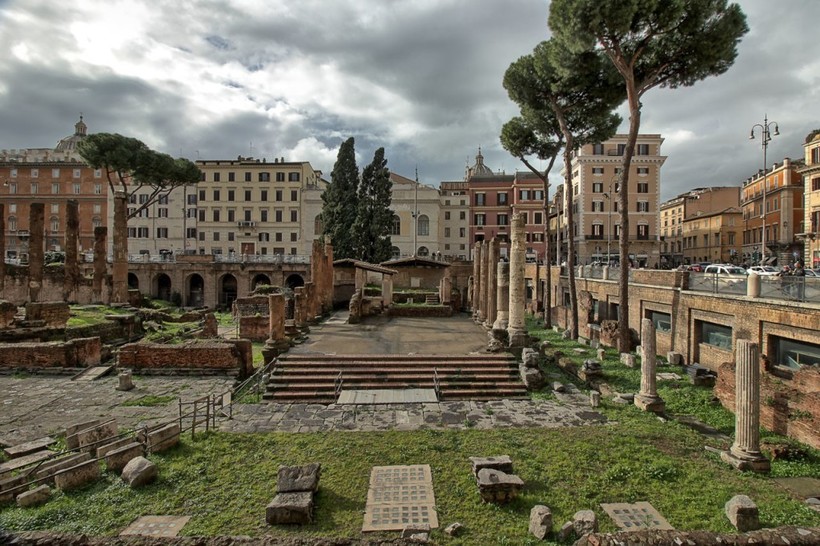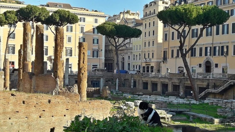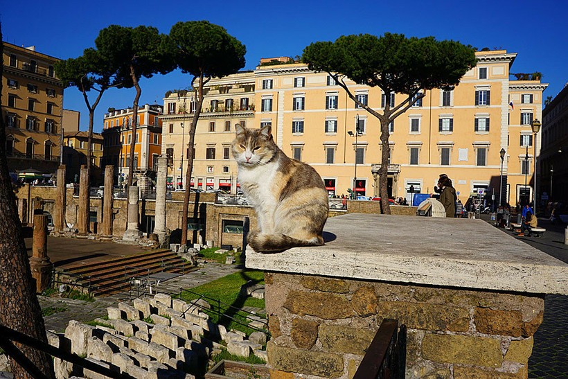 В жизни место оказалось намного более интересным и живописным, чем на фотографиях. Руины храмового комплекса, занимающие место почти в квартал в самом центре Рима, находятся на три метра ниже уровня дороги, и благодаря этому мне было очень удобно рассматривать и их самих, и лениво развалившихся то тут, то там цветных пушистиков.