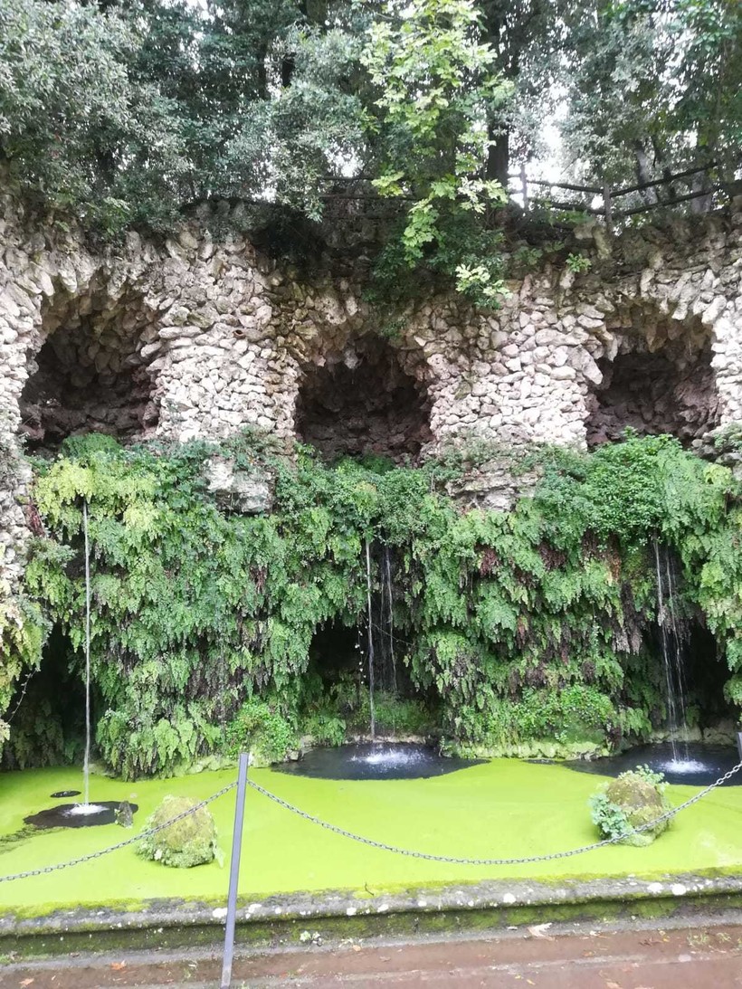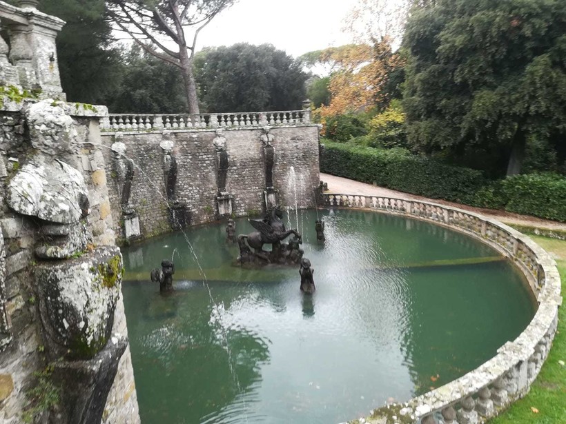 Когда мы вошли на территорию виллы, обратили внимание на довольно большой и красивый фонтан Пегас: полукруглый бассейн возле каменной стены с фигурой пегаса в центре.