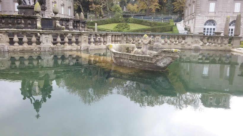 Он производит впечатление! Большой квадратный бассейн, разделенный на четыре части, в каждой из которых «плавает» каменная лодка с лодочником. В центре – фонтан с четырьмя фигурами мавров, которые держат герб одного из владельцев виллы.