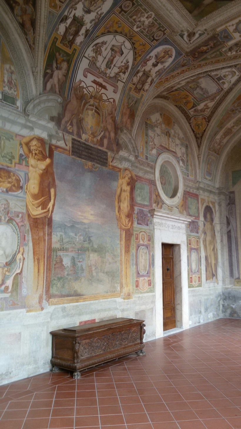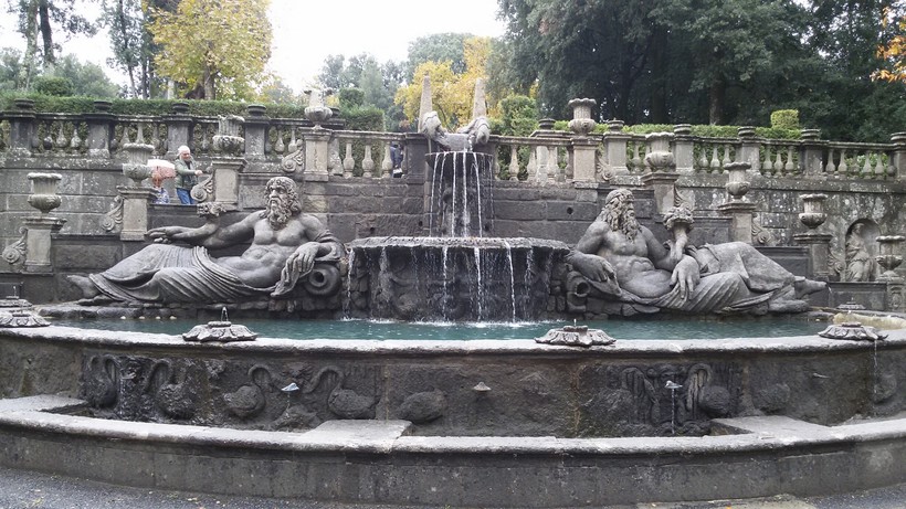 Красивый фонтан Гиганты со статуями, символизирующими реки Тибр и Арно. Фонтан украшен вазами, статуями в нишах стен.
