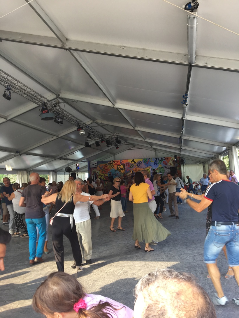 В замке и в парке было очень много народу, причём как туристов, так и местных жителей. Видимо такой островок зелени в центре огромного Милана, привлекал многих желающих отдохнуть, слева рядом со стенами замка было много различных павильонов, откуда доносилась музыка. В одном из павильонов пожилые итальянцы играли в настольные игры, в другом дети делали какие то поделки. В самом большом павильоне, где играла музыка, люди танцевали.