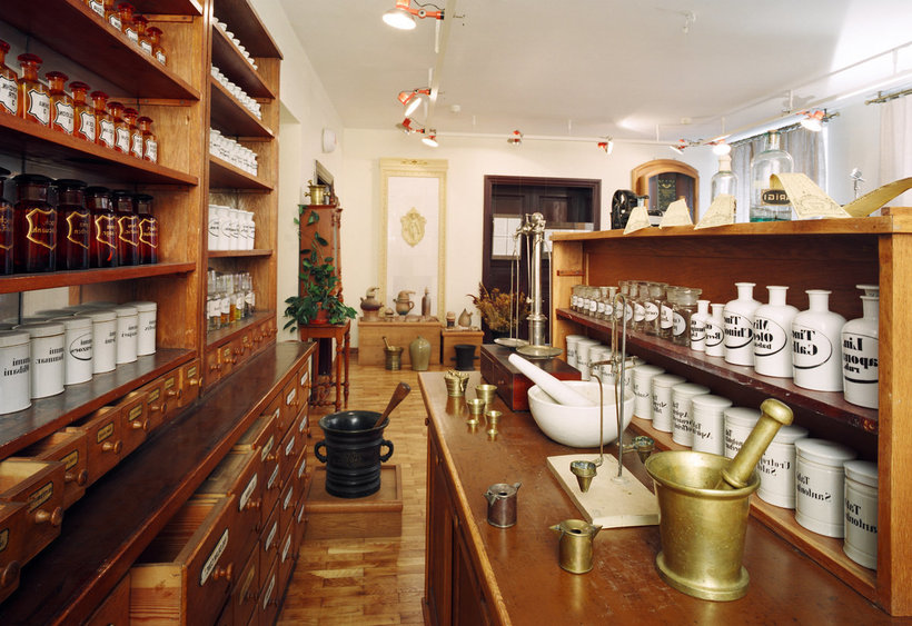 И фармацевтика с ее склянками, чашками, ступками, химическими растворами и порошками. Даже можно увидеть как выглядела аптека в 19 веке.
