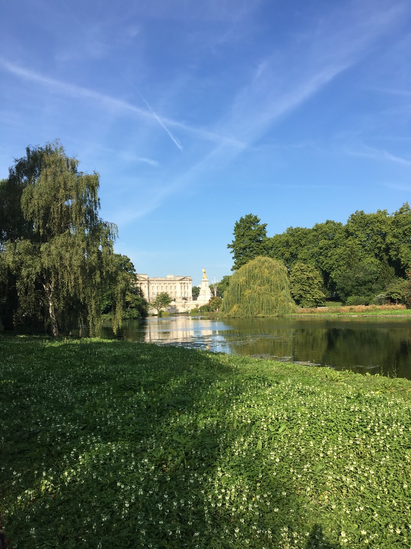 Мой отель был расположен рядом с Гайд-парком, поэтому я пошла к Букингемскому дворцу пешком. Прогулка по Гайд-парку была, довольно волнительна. Идти первый раз по парку, который часто упоминался в книгах и фильмах, которые я читала и смотрела много лет, даже не думая, что когда-нибудь пройдусь здесь сама, было приятно. Я прошла через Гайд-парк и вошла в Грин-парк, который был значительно меньше и на краю которого был расположен Букингемский дворец. Так получилась, что первый раз я подошла к дворцу как бы с его не парадной стороны. Может быть поэтому, огромный Мемориал королевы Виктории, стоящий перед дворцом я первый раз не сразу заметила.