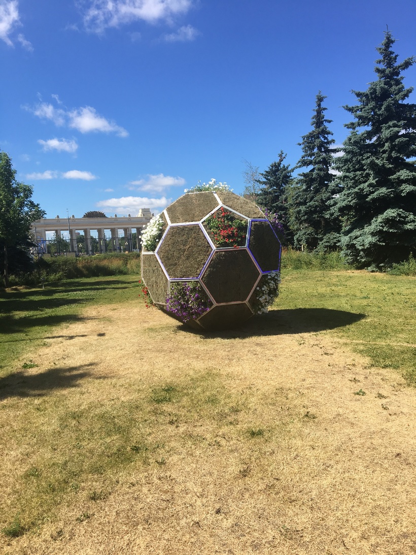 Потом прошлась по дорожкам сквозь деревья, которые всегда тут росли, но для выставки их немного обыграли по новому. На поляне между деревьями, была интересная цветочная скульптура в виде мяча, в этом году Москва принимала чемпионат мира по футболу.