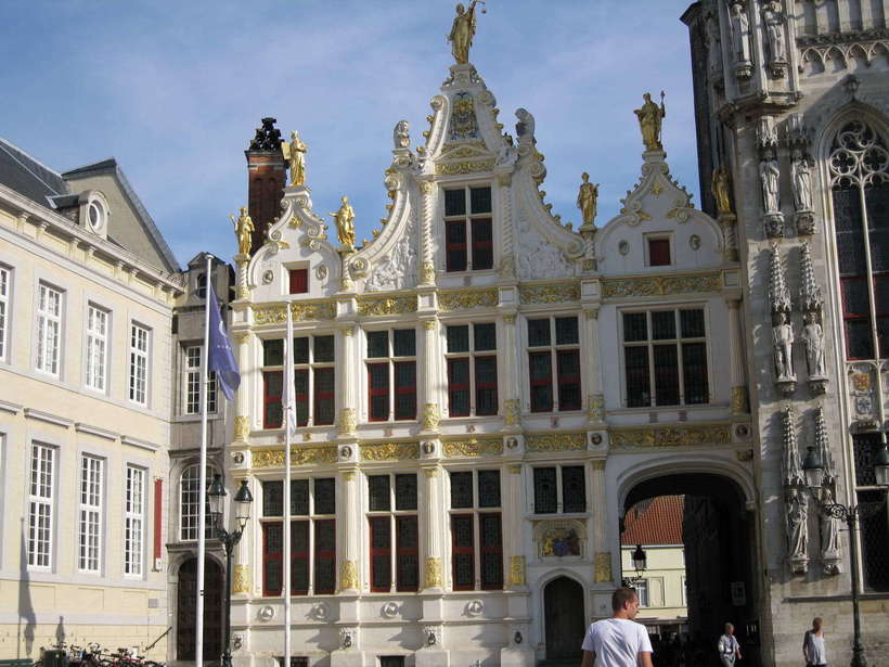 Самая главная достопримечательность самой площади – это Ратуша. Само здание выполнено в готическом стиле и с виду кажется темным, мрачноватым (словно старый замок), но очень впечатлительным. Я застала Ратушу, когда она выглядела очень торжественно: Ветер раздувал яркие флаги, каждый шпиль стремился в голубое небо... Стоит задуматься, что Ратуша является самым древним сохранившимся памятником архитектуры не только в Брюгге, но и во всей Фландрии. Я знаю, что мало кто присматривается к выточенным скульптурам в нише стены. Присмотритесь лучше, там же целая картина из библейских персонажей! Ещё не забудьте зайти внутрь. Как же меня поразили эти дубовые потолки, витражи…!
