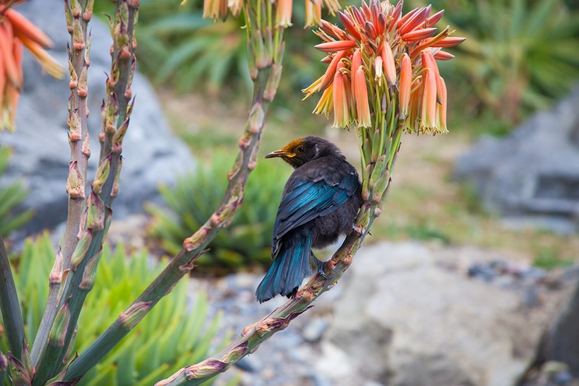 В этом саду к нам прилетела птица туи – одна из уникальных новозеландских птиц. Села на здоровенный цветок, сунула клюв в бутон и принялась, поганка такая, обедать. Мя с подругой присели на корточки, чуть ли не по-пластунски подобрались, чтобы ее сфотографировать. А сытая птица поворачивалась то одним, то другим боком, выклёвывая что-то в цветке. Видать, особо вкусные жучки там квартируют...
