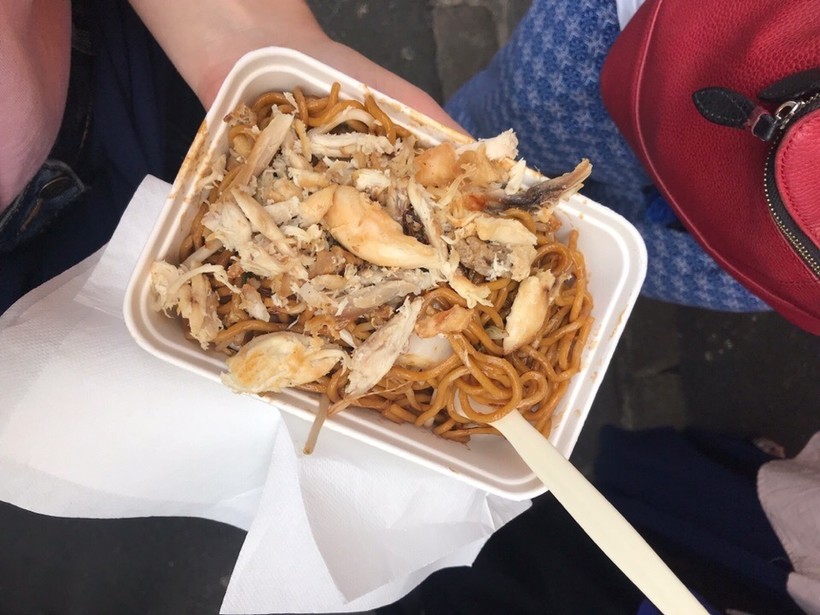 - Порой негде сесть. По периметру рынка можно заметить множество людей, сидящих прямо на тротуаре, бордюре, выступах стен кафе. Специальных мест (помимо кафе) для сидения нет (либо их было так мало, что я не заметила), поэтому если брать уличную еду – придется сливаться с остальными туристами и сидеть где придется.