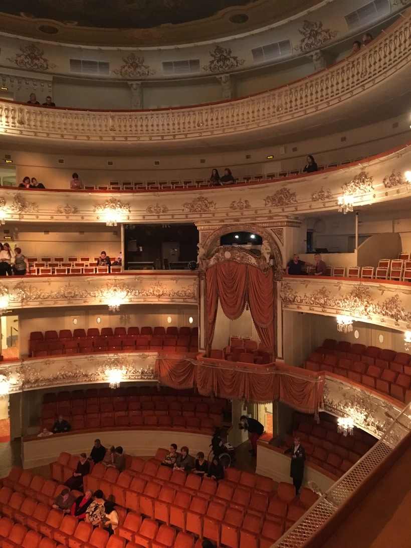 Я пришла одной из первых, удивительно, но людей у театра совсем не было. В Москве, когда ты только приближаешься к театру, всегда видно небольшую группу у входа. Здесь же, никто не стоял у входа, так, что я даже забеспокоилась, не отменили ли спектакль. Зайдя внутрь я предъявила свой билет и спокойно прошла внутрь. Основной народ начал собираться за 10 минут до начала, в Москве люди приходят гораздо раньше.