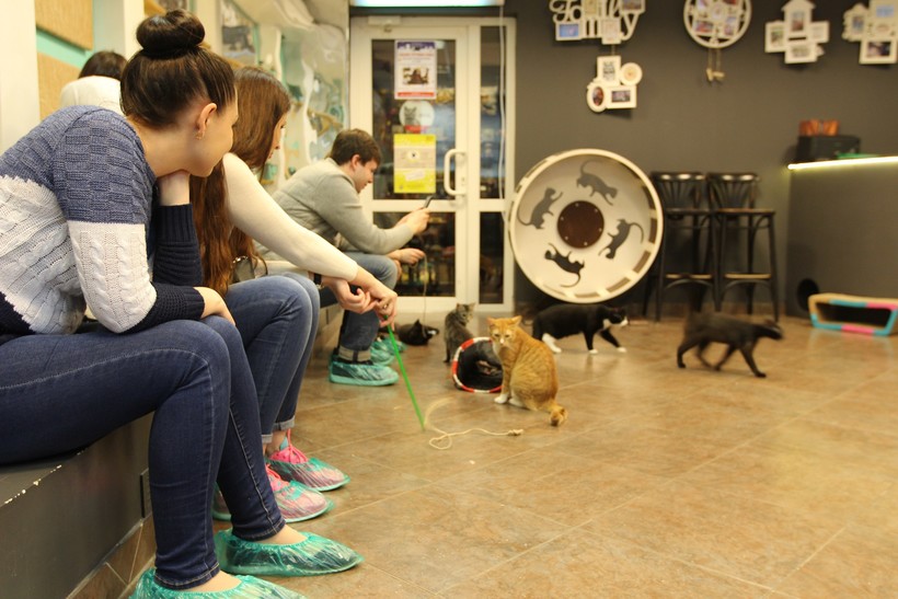 Итак, о самом посещении: вы заходите, вам обязательно нужно помыть руки, вычистить подошвы сапог. Нас не заставляли надевать бахилы, но, в принципе, в холодное время года, возможно, заставят. Вы заходите в сопровождении сотрудника кафе в помещение, где находятся кошки. С ними всеми можно играть, их можно фотографировать, гладить, тискать. Естественно, предупреждают, у кого из котов какой характер, и если какой-то котик не очень любит, чтобы его брали на руки, то сотрудник кото-кафе об этом обязательно скажет.