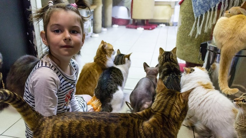 Чем хороша «Республика кошек»? Во-первых, там сейчас живёт довольно много животных, 25 кошек 17 пород, в том числе, если я не ошибаюсь, котята. Они обитают в очень приятных условиях, они ухоженные, прекрасные, среди них есть так называемые эрмитажные коты – это коты, которые прибились к знаменитому Эрмитажу, но, к сожалению, всех их прокормить руководство музея не может, поэтому их отдают в «Республику кошек», и все желающие могут взять себе эрмитажного кота, приютить его дома и жить с ним долго и счастливо.