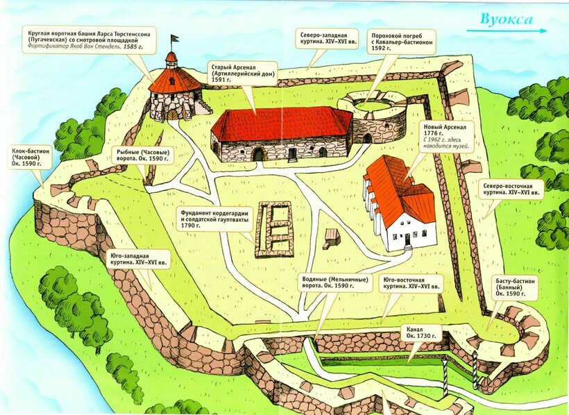 - Корела — когда крепость стала относиться к Новгородскому княжеству, новгородцы возвели бревенчатые стены (XIII–XIV вв.);