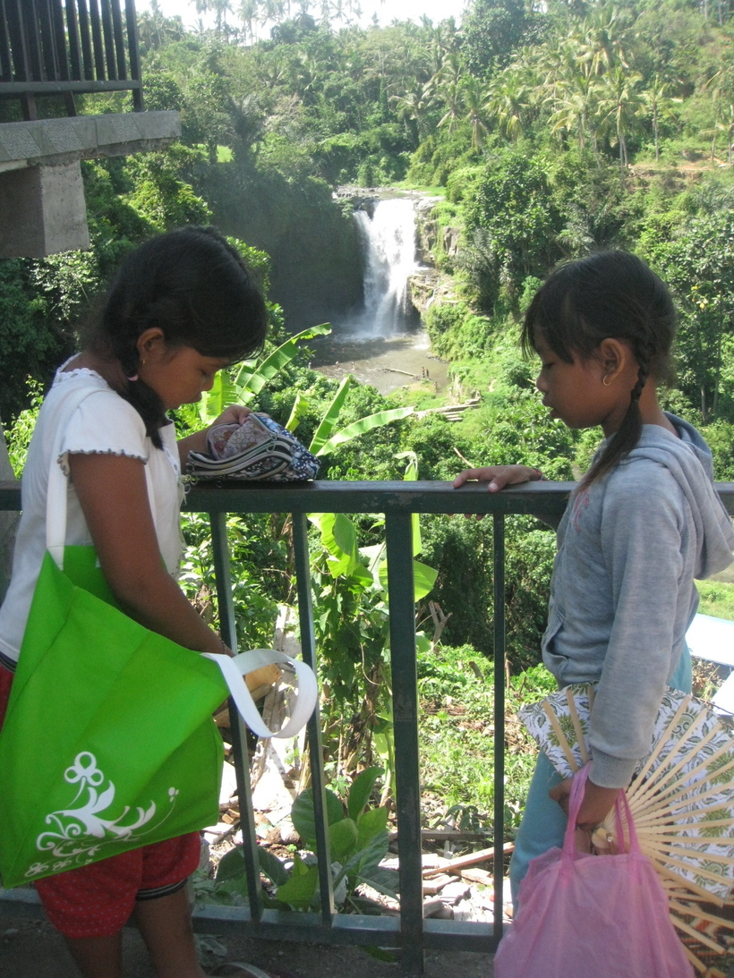 После спуска к подножию водопада и подъёму наверх по длинной лестнице через джунгли, можно передохнуть и посидеть в кафешке. Можно заказать еду, а можно просто попить балийский кофе-здесь он потрясающий! Кафешки все открытые, поэтому вид из них очень здоровский, как и со смотровой площадки! А можно пообщаться с местными жителями и попытаться выговорить за балийцем название водопада на местном языке. Русскому человеку сделать это практически невозможно, поскольку нет в русском языке таких странных звуков:)