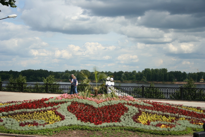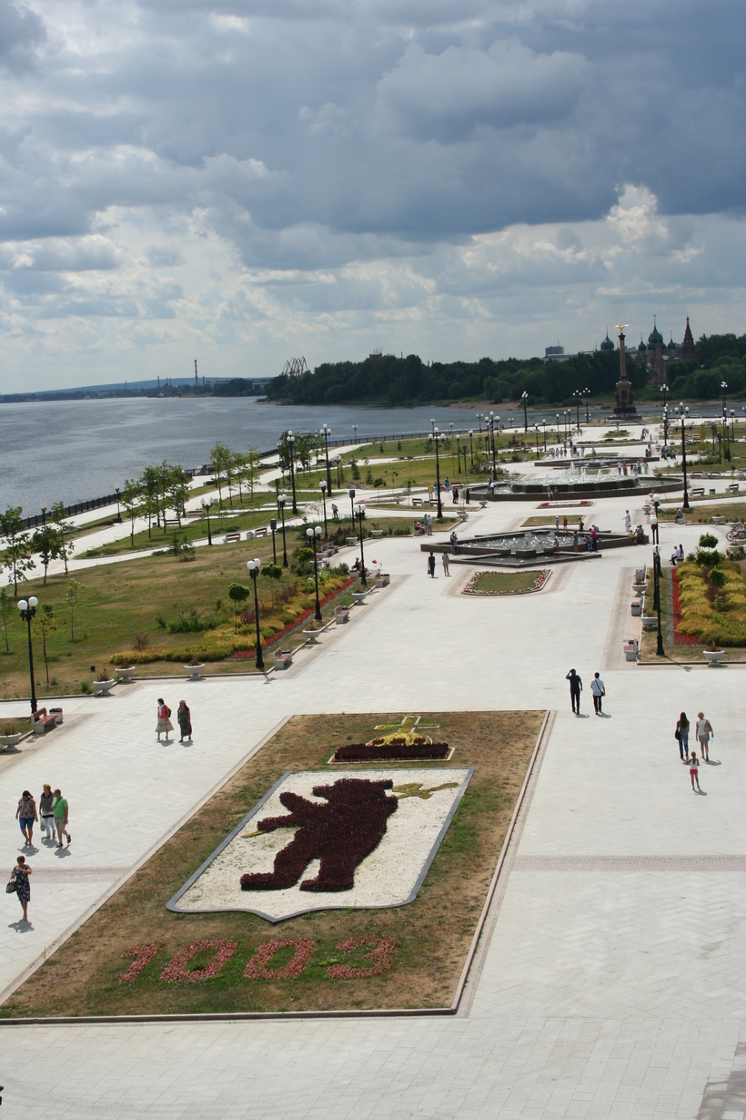 Когда стоишь чуть повыше на самой Волжской набережной, то вид открывается очень красивый. Само по себе место, где Которосль впадает в Волгу, и там есть отдельные острова, - оно совершенно дивное. И ещё, повторюсь, Стрелку очень красиво украсили этими клумбами и фонтанами. На клумбах выложен рисунок в виде медведя. Куда ж без него.