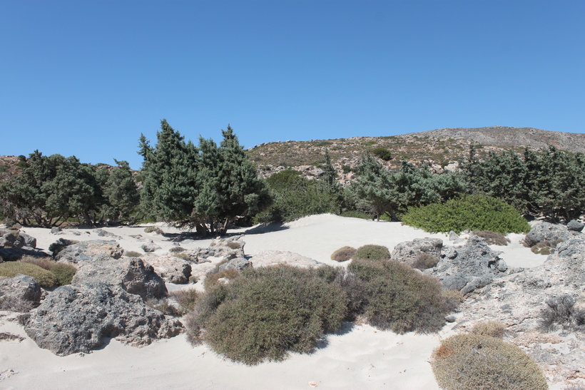 Первый. Оставить машину у платной охраняемой парковки пляжа Элафонисси, пройти насквозь пляж Элафонисси и пройти пешком по маркированной экологической тропе Кедродасос.