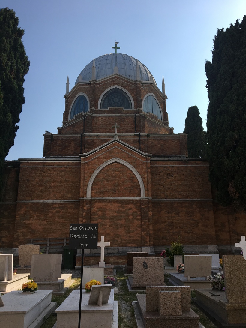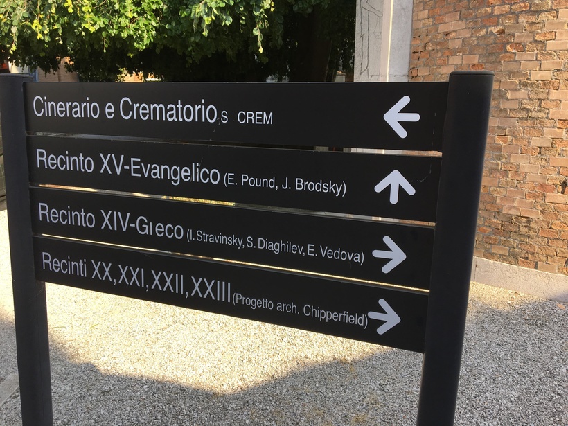 Потому что мы попали в забавную ситуацию. Отправились искать Стравинского, Дягилева (найти просто – там пуанты), потом просто смотрели скульптуру, наслаждались покоем, кипарисами, вечерним солнцем и тут вдруг услышали объявление, мол, кладбище закрывается! И несмотря на то, что указатели там неплохие и кажется, что все вообще-то понятно, мы минут десять метались по участками, не понимая, куда вообще идти и где выход. Потом, конечно, сориентировались и на вапоретто, конечно же, успели. Но в какой-то момент было немного не по себе. Потому что, при всей красоте Сан-Микеле, оставаться там с ночевой не хотелось бы. Хотя я все же думаю, что какой-нибудь сторож нашел бы нас.