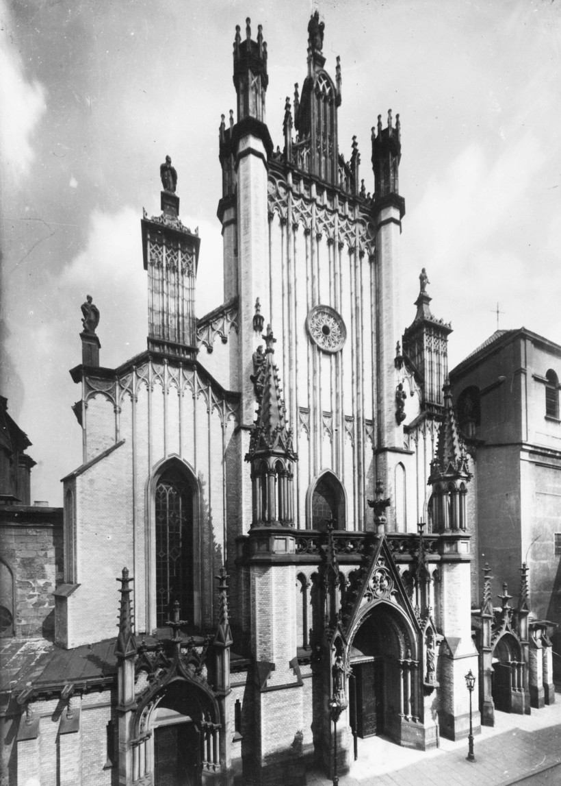 Куда интереснее другое. Многие знают, что в конце Второй Мировой Варшаву практически сравняли с землей, после чего город отстраивали заново, и исторический центр не исключение. Так вот, в случае с Собором Святого Иоанна здание восстановили не в довоенном облике, а в том виде, в каком, по мнению ученых, был выполнен самый первый собор, заложенный в конце XIV века. Непосредственно перед войной собор выглядел вот так.