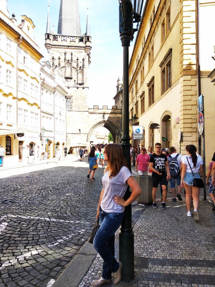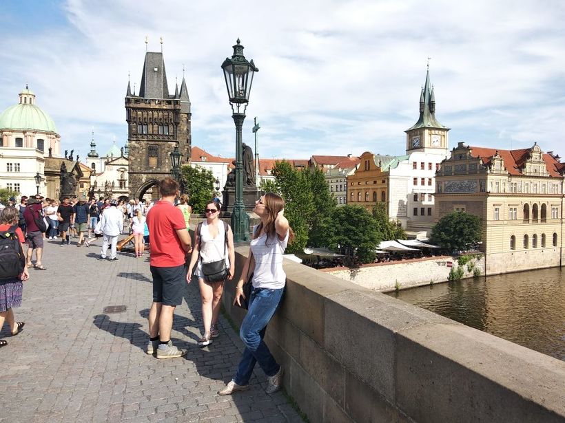У меня был шикарный план: надеть красивое платье, прийти в 5-6 часов утра на Карлов Мост и замутить романическую фотосессию. Но я люблю спать, а спать любит меня, и в итоге в этот раз спать меня победило, и добрались мы до Карлового моста в полдень. В самый солнцепек, да. :) Карлов мост соединяет два красивейших исторических района Праги Старе Место и Малу Страну, так что так или иначе, но вам придется по нему прогуляться. Для меня исторические районы Праги кажутся уж очень запутанными, поэтому в поиске тех или иных достопримечательностей мы ориентировались на мой внутренний навигатор и "а не подскажите ли..." ибо карты тут бессильны. Так мы и вышли со стороны Староместской площади непосредственно к мосту.