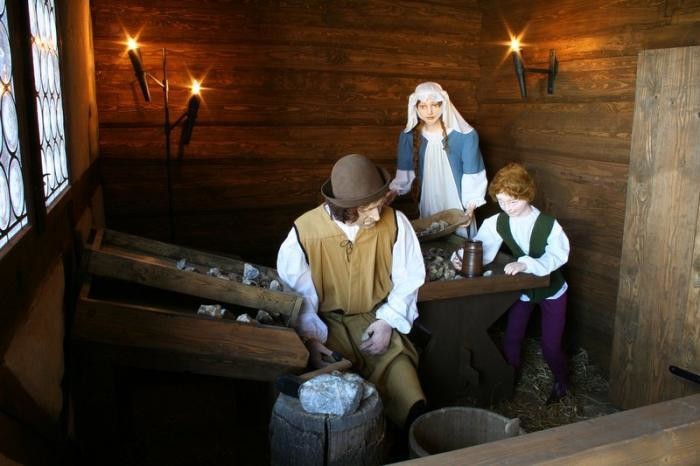 Здесь представлены небольшие домики, место, где проводилось дробление руды, плавильные печи, для наглядности установлены фигуры самих шахтеров и их домашних, то есть можно представить не только как работали шахтеры, но и как жили.