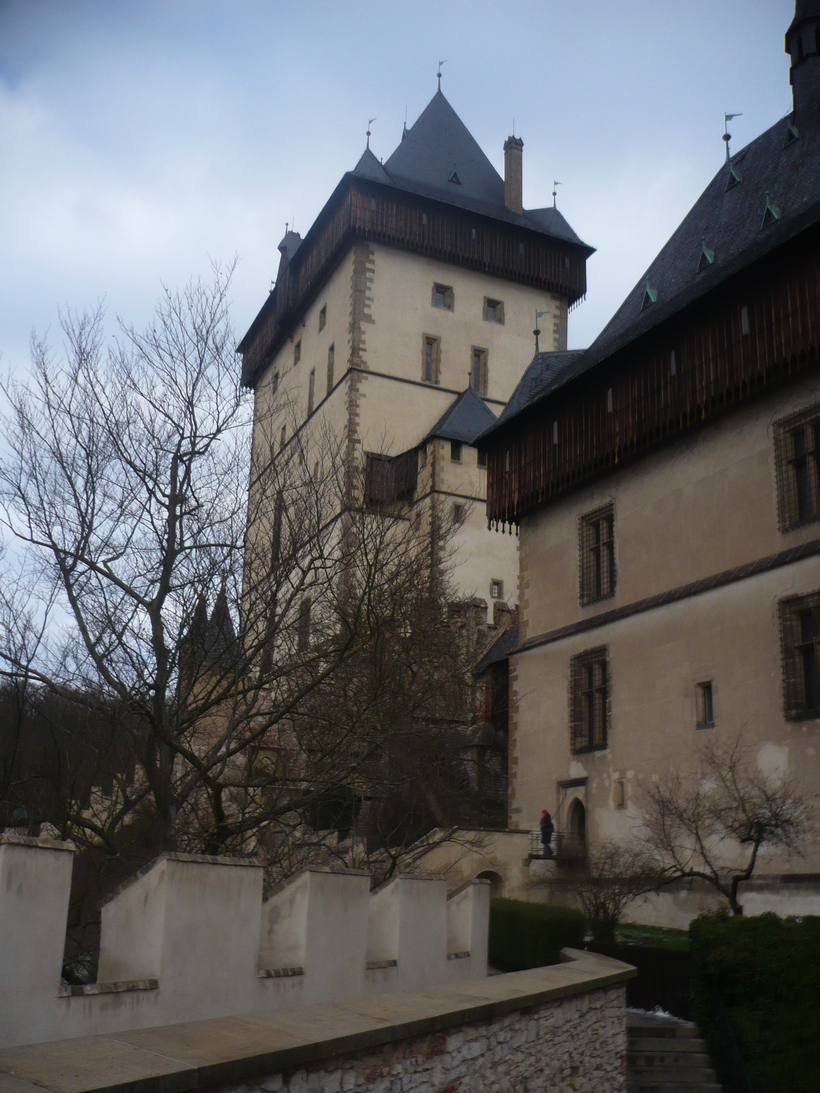 Замок был построен по проектам известного в то время в Чехии архитектора – Маттея из Арраса в 1348 году. С того времени сохранилась ступенчатая композиция замка, обусловленная рельефом местности, ну и соображениями относительно оборонительной работоспособности сооружения, общее объемно-пространственное решение и частично интерьеры. Но безусловно, главное место в Карлштейне занимает верхний замок с императорским дворцом и большой башней – доминантой всего комплекса, откуда открываются захватывающие виды на весь Карлштейн.
