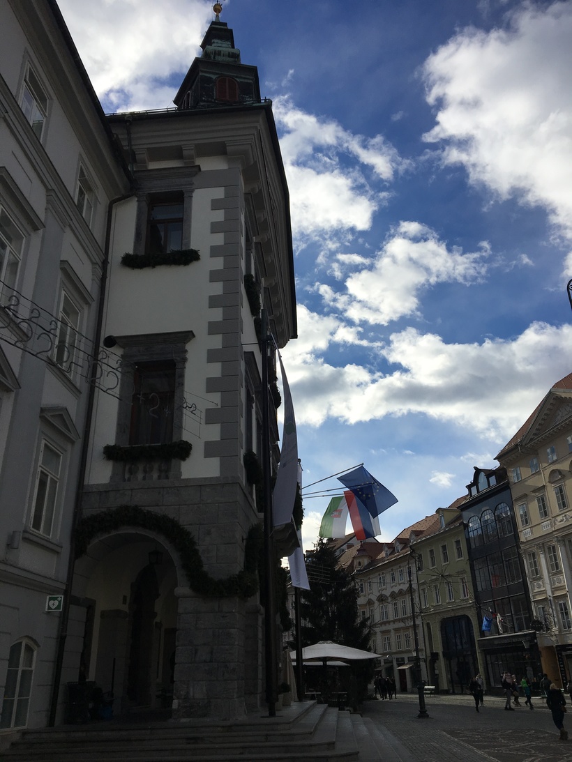 Старый город Любляны я видела впервые, но он сразу мне понравился. Может быть атмосфера новогодних каникул и яркие ёлки внесли свою лепту. Туристов было не много, я прошла по небольшой улице и вышла к городской Ратуше.