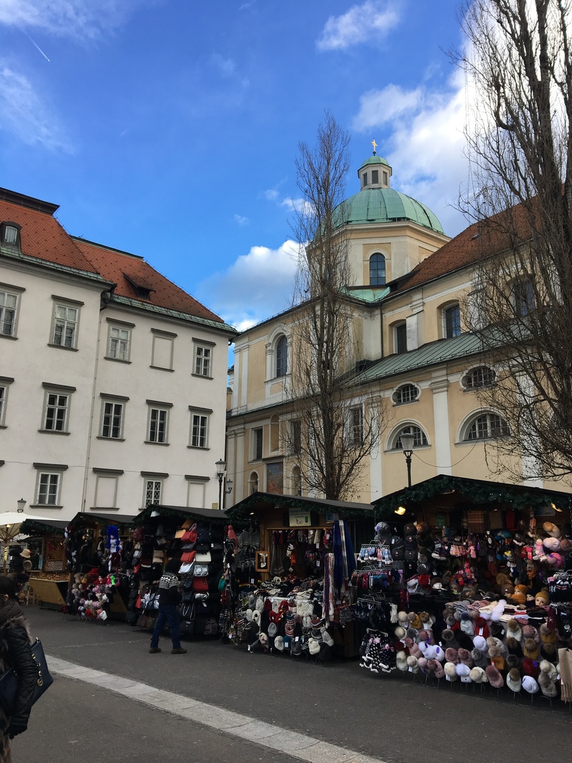 Поездка в Любляну, столицу Словении, принесла мне массу позитива. Погода была шикарная и город остался в моей памяти ярким и солнечным. Я погуляла по улочкам Старого города, поднялась на фуникулёре к замку, зашла в церковь, красиво украшенную к Рождеству, постояла на мостах, через речку Любляница. Любляна очень приятный и немноголюдный город, совсем не похожий на европейскую столицу. В Любляне много магазинов. Торговый центр на площади Прешерна имеет столетнюю историю, там масса магазинов известных брендов. На улицах полно магазинов с одеждой и обувью. Да и продуктовые магазины на каждом шагу, с большим выбором европейских продуктов.