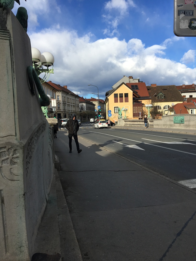 Должна сказать, что подходя к мосту, я испытала некоторое разочарование. Дело в том, что в основном, мосты в Любляне пешеходные, более узкие и уютные. Мост Драконов, достаточно широкий и по нему интенсивное движение транспорта, а вовсе не туристов.