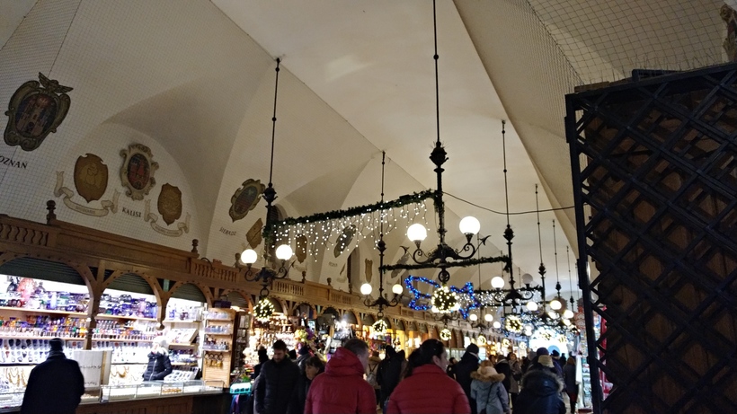 - Прикупить сувениров. Я, конечно, уже давно этим переболел и покупаю сувениры только в очень знаковых местах (в ту поездку это была Величка), но если вы любите туристические безделушки, во внутренней аллее Сукенниц их выбор поистине огромен. Кстати, когда будете гулять по ярмарке, посмотрите на стены и потолок, украшенные гербами польских городов.
