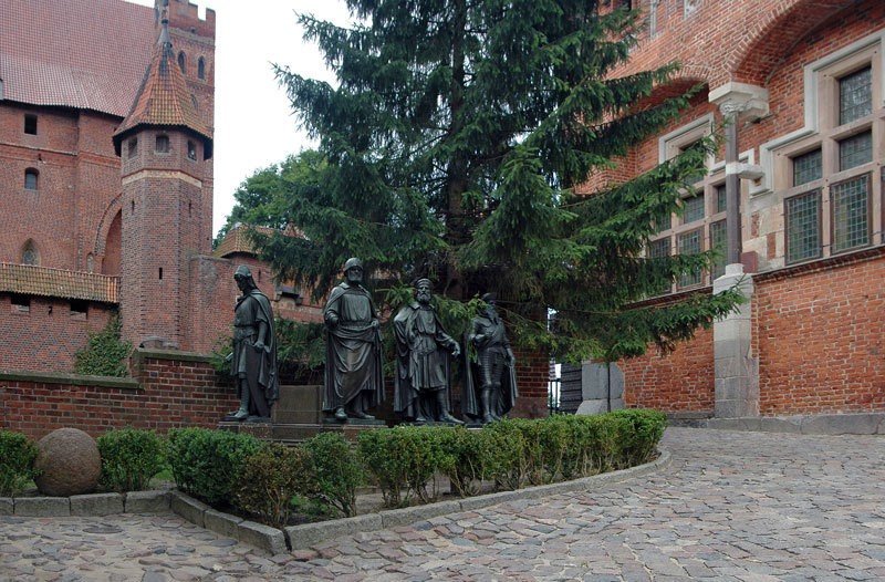 Не знаю, по какой причине все стремятся попасть внутрь, когда и во дворе есть масса интересных достопримечательностей. Первое, что мне бросилось в глаза - это памятники людям в рыцарском облачении. Оказалось, что это магистры Тевтонского ордена, чья резиденция была в замке во времена средневековья.