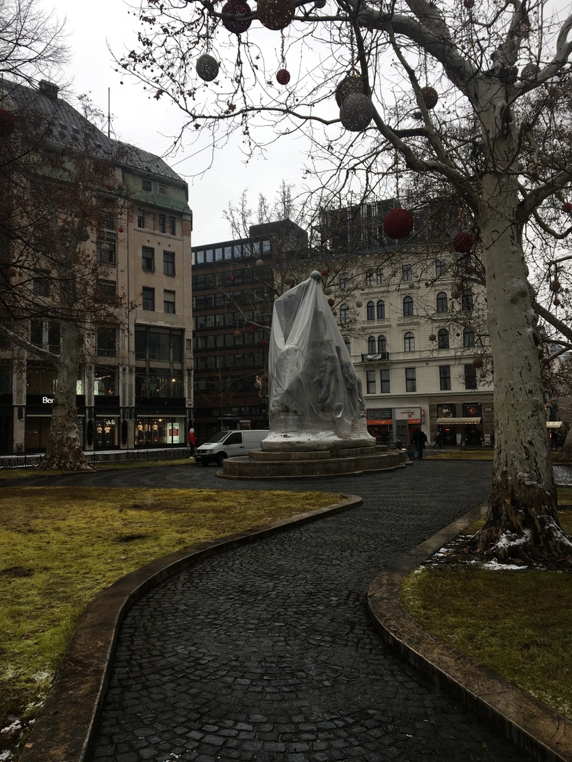 На площади Вёрёшмати расположен огромный памятник, даже целая скульптурная композиция. А вот главное разочарование мое состояло в том, что памятник был заботливо укутан на зиму. Так что, можно только предположить какой он.