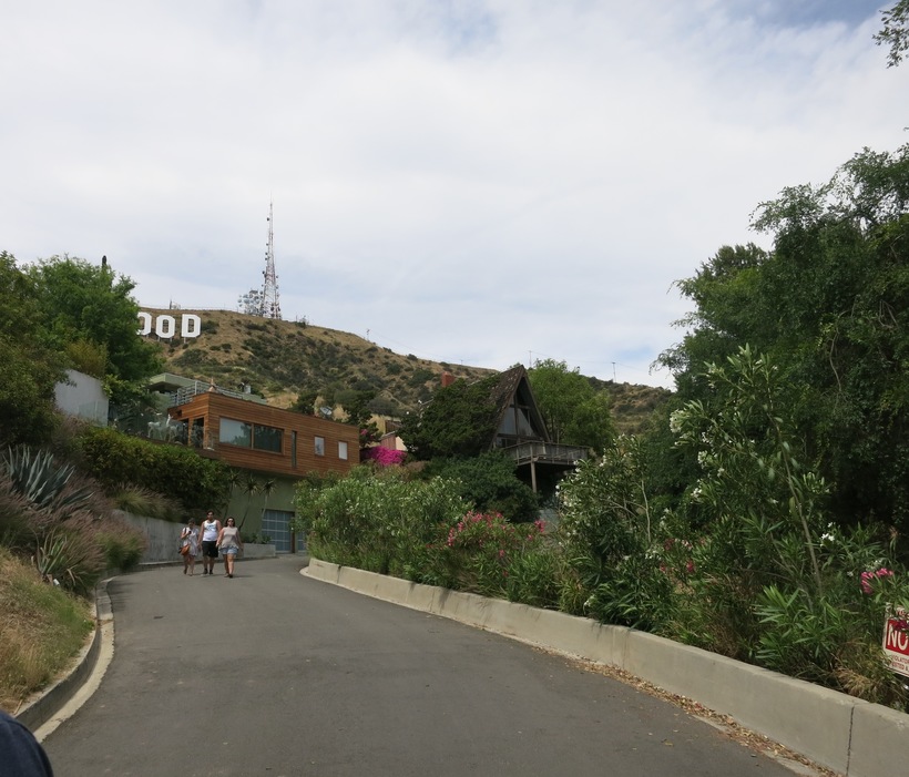 Дальше стоит шлагбаум. Сначала мы сомневались, стоит ли проходить через него. В Америке строго относятся к нарушению личных границ и проникновению на частную территорию. Но мы не обнаружили никаких запрещающих или предупреждающих знаков и отправились пешком, чтобы все таки увидеть в непосредственной близости главный символ Голливуда. Мы шли вверх по дороге пару минут. На месте где мы остановились обзор потрясающий.