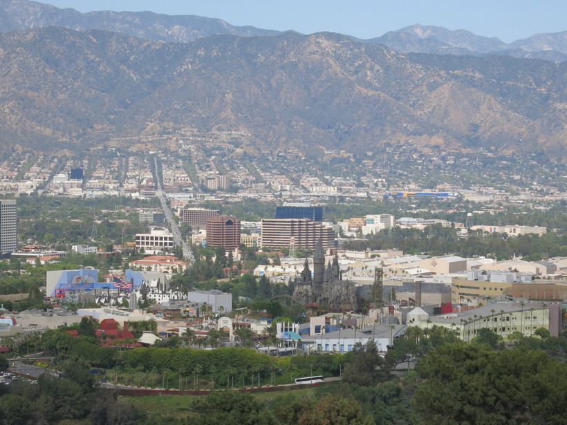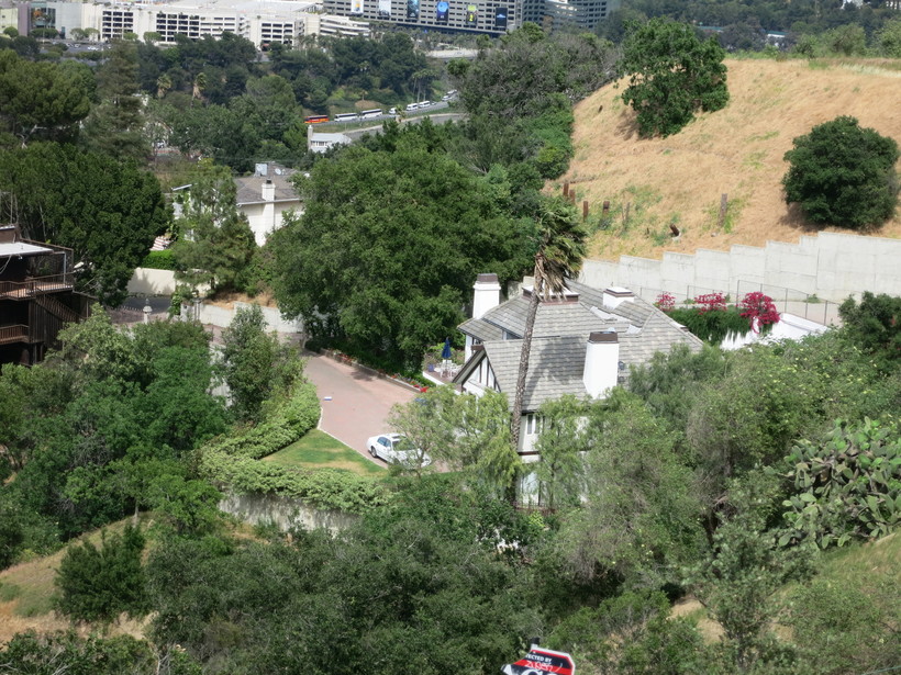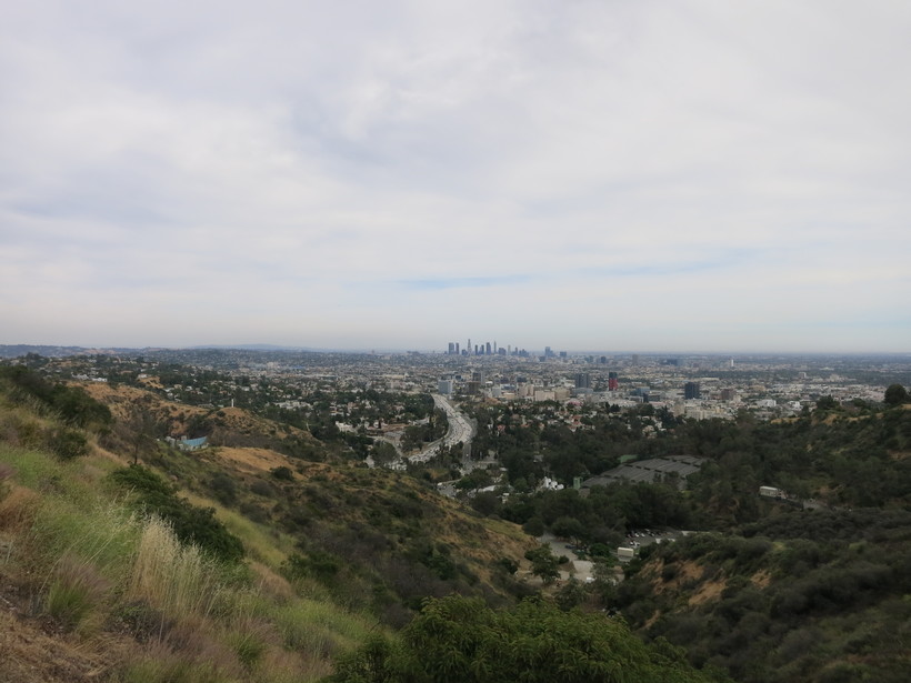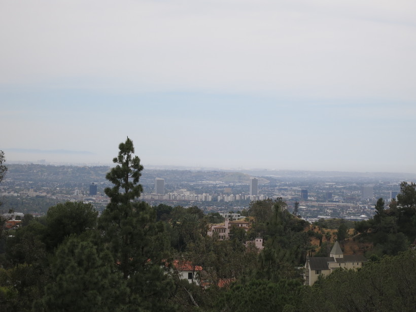 Но, как оказалось, шли мы зря, так как с другой стороны холма обзор закрывают кусты и деревья.Мы вернулись обратно к обзорной площадке и внимательнее разглядели панораму, открывающуюся с Голливудских холмов. Отсюда видно Лос-Анджелес, пригород и Даунтаун,а также дома и виллы расположенные у подножия холма.